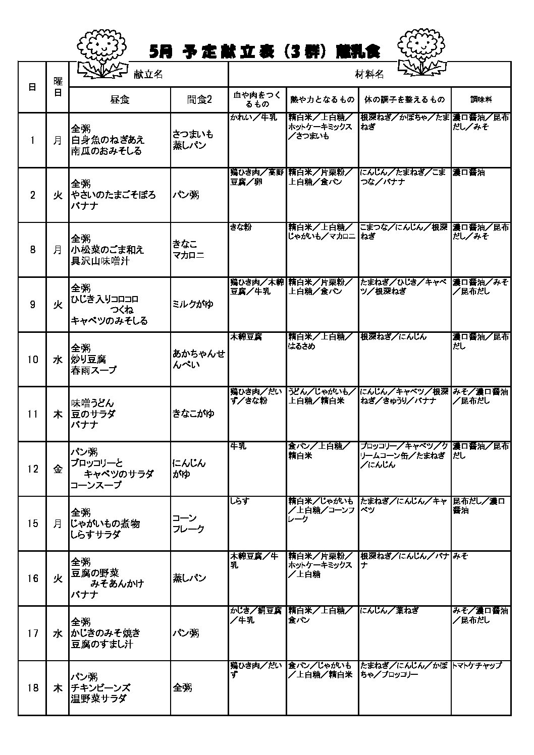 2023年5月 献立表 離乳食