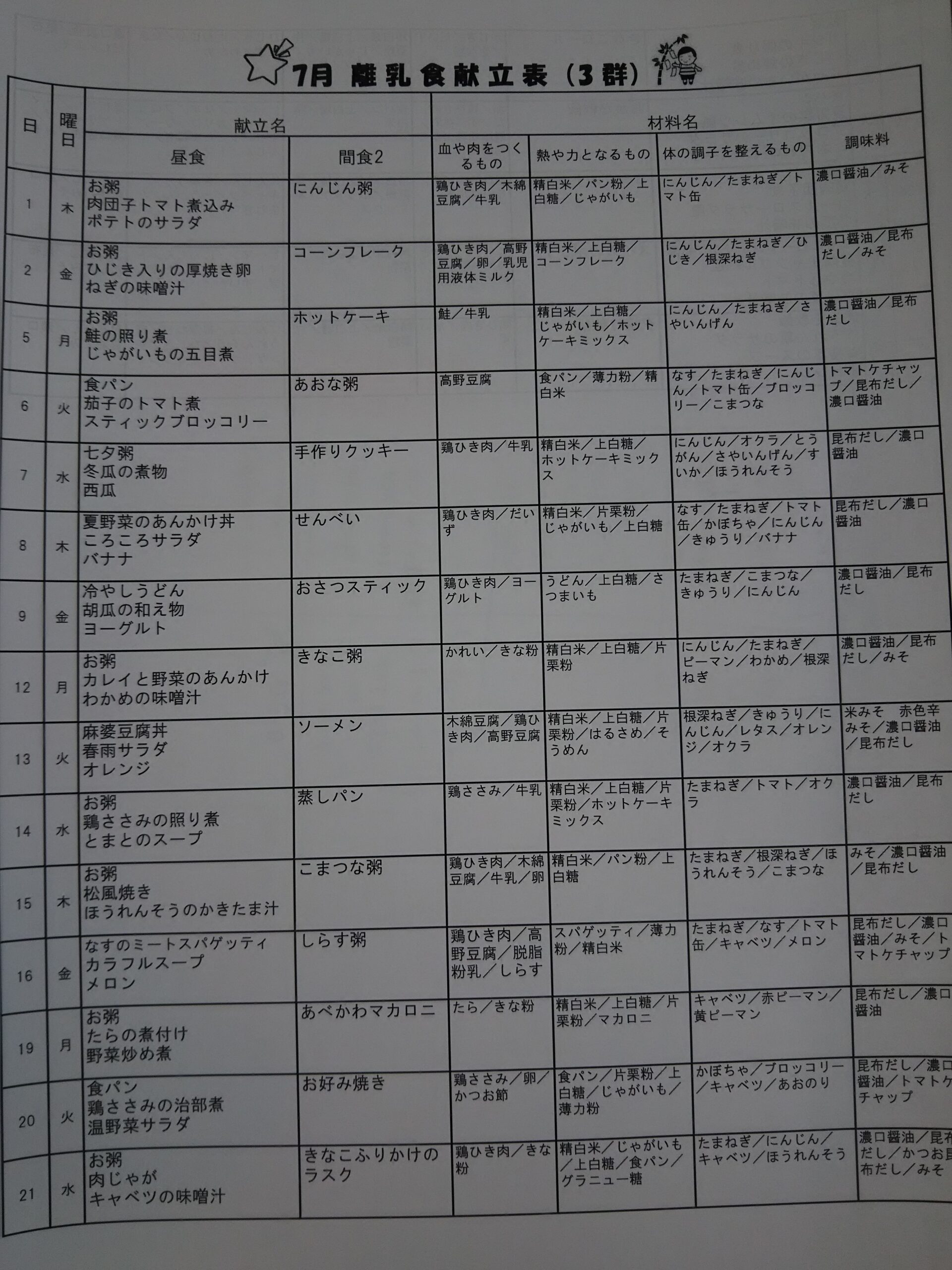 2021年7月 離乳食献立表