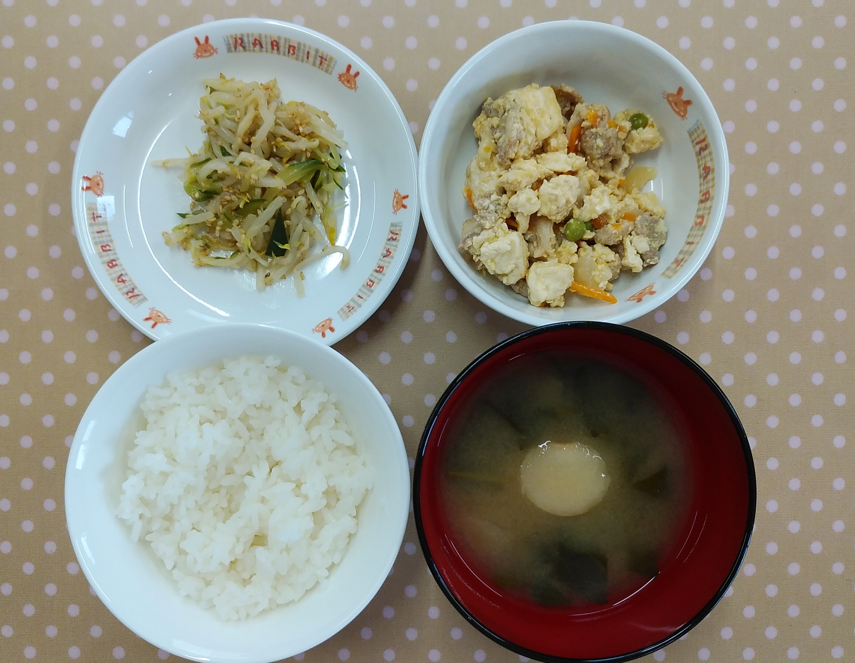 ご飯・具沢山の炒り豆腐・胡瓜のごま酢和え・小松菜の味噌